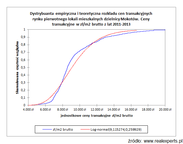Rys. 2. Porównanie dystrybuant empirycznej cen jednostkowych i teoretycznej rozkładu rozkładu log-normalnego poddało przypuszczenie, że mamy do czynienia nie z jednym rynkiem o charakterze log-normalnym a z wypadkową kilku sub-rynków.