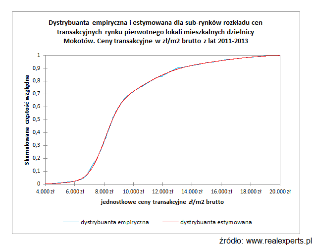 Rys. 4. Porównanie wyestymowanej wypadkowej dystrybuanty dla 3 sub-rynków i dystrybuanty empirycznej cen jednostkowych wykazuje bardzo wysoką zgodność.