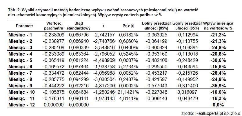 Wyniki estymacji wpływu kwartału roku na wartość nieruchomości komercyjnych pokazały stwierdzić, że w stosunku do kwartału 4. ceny w kwartałach 1./2. są o ok. 16,8-17,2% niższe a w 3. kwartale o ok. 24,2% niższe.