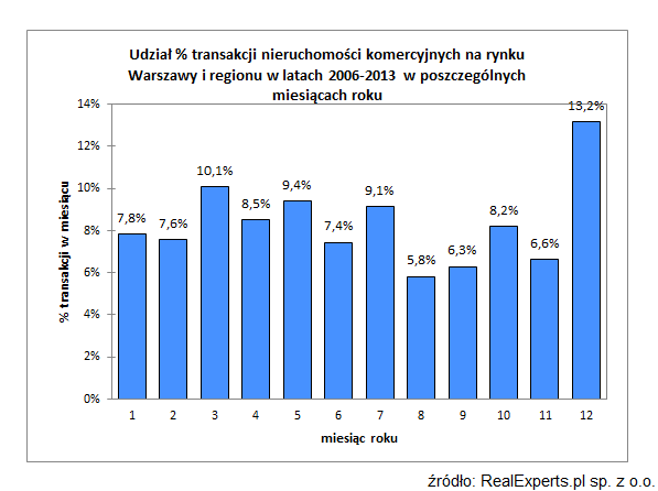 Jednocześnie daje się zauważyć zróżnicowanie dotyczące liczby transakcji w danym miesiącu roku – w grudniu notowane są nie tylko najwyższe ceny ale także największa liczba transakcji, co wzmacnia pewność występowania „efektu grudnia” na rynku nieruchomości komercyjnych.