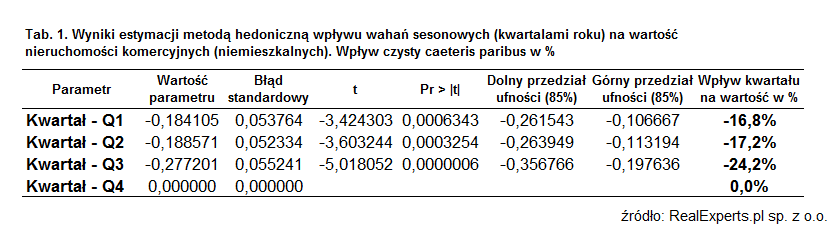 Tab. 1 Wyniki estymacji metodą hedoniczną wpływu wahań sezonowych (kwartałami roku) na wartość nieruchomości komercyjnych (niemieszkalnych). Wpływ czysty caeteris paribus w %