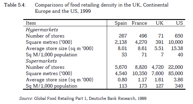 Comparisons of food retailing density in the UK, Continental Europe and the US, 1999