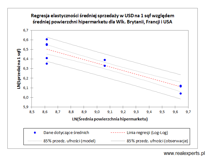 Posiadając te dane dla Wielkiej Brytanii, Francji i USA można pokusić się o bardzo prostą analizę określającą jaka występuje liczbowa zależność pomiędzy średnią wydajnością powierzchni sprzedażowej a średnią powierzchnią sklepu. Oczywiście, w postaci elastyczności (zależności logarytmiczno-logarytmiczej = potęgowej) dającej się porównać z innymi wynikami badań, zwłaszcza z uzyskanymi w ogólnopolskim modelu V2 wartości nieruchomości handlowych realexperts.pl i badaniami A Olearczyka.