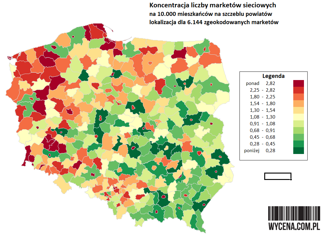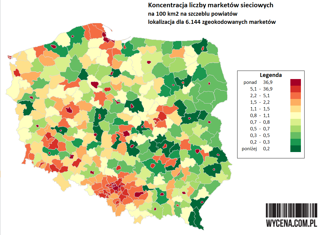 W ramach tworzenia w realexperts.pl wersji V2 ogólnopolskiego modelu wartości nieruchomości handlowych zajęto się także m.in. kwestią rozmieszczenia geograficznego sieci sklepów handlowych na obszarze kraju. Jest to istotny czynnik wyjaśniający dla określenia parametrów lokalizacji dla nieruchomości handlowych.